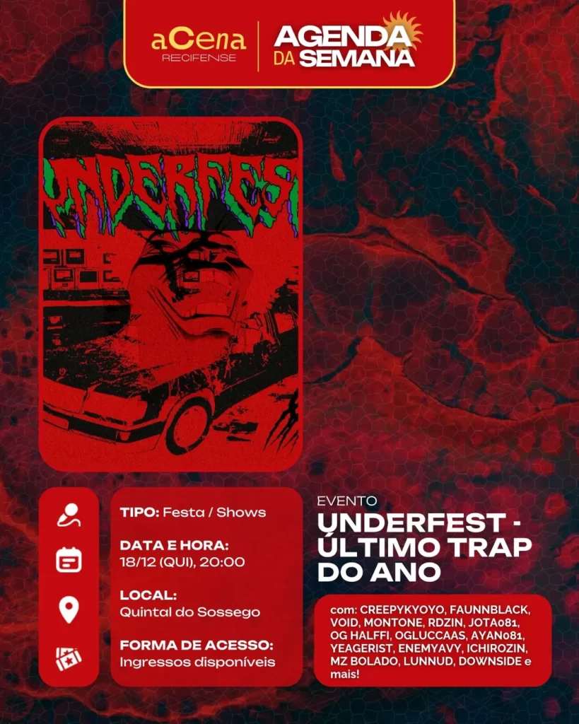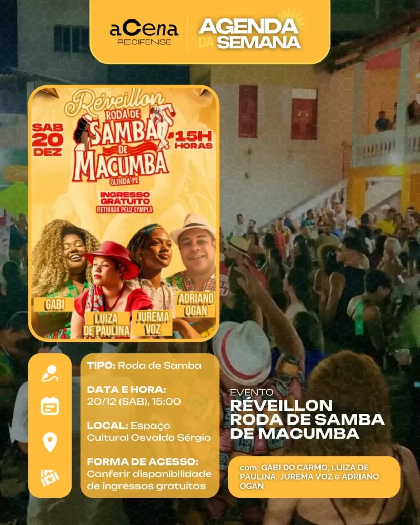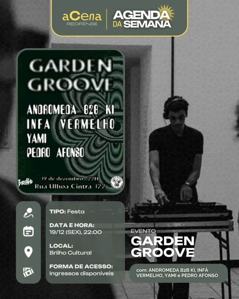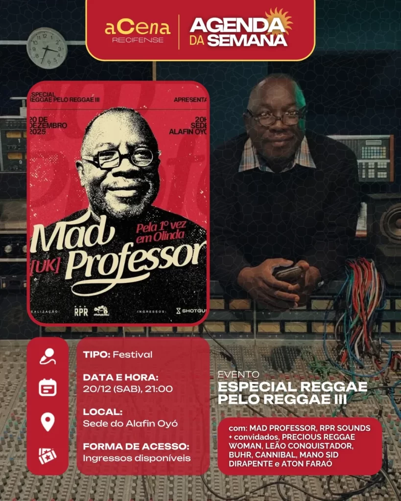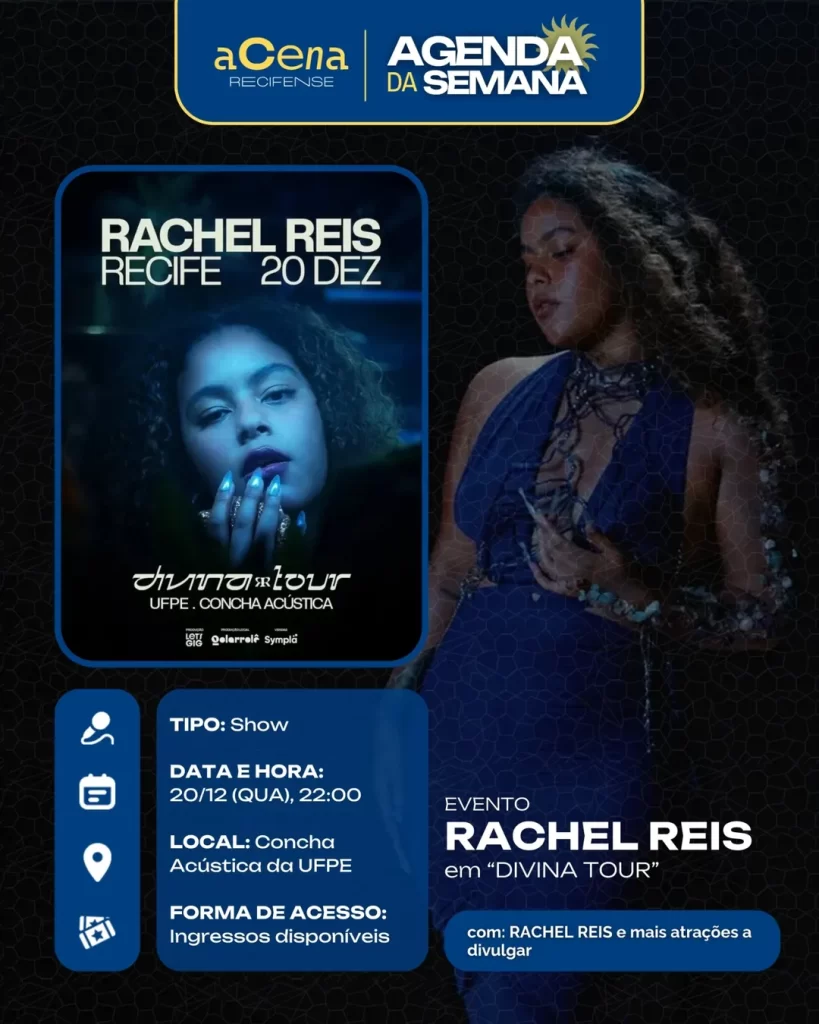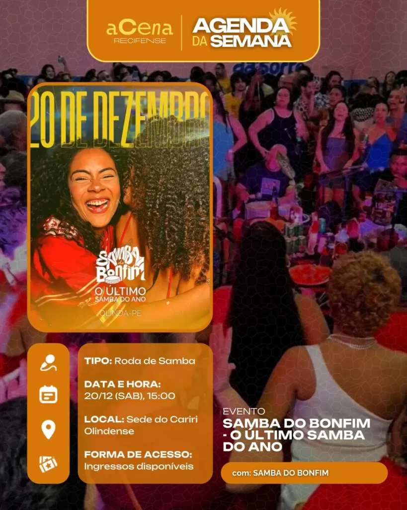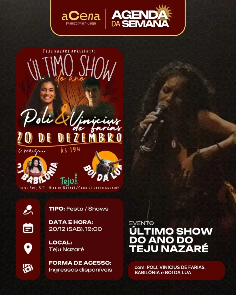 fevereiro 10, 2026 Agenda da Semana: Shows, Festas e Festivais entre 01/12 e 07/12 Agenda Cultural rodrigo Compartilhado FacebookTwitterPinterestWhatsApp Escute a matéria Chegou ela, a mais esperada: a agenda da semana do aCena! Pois o ano pode estar acabando, mas a vontade de sair de casa não! Autor rodrigo Compartilhe Compartilhado FacebookTwitterPinterestWhatsApp Artigo anteriorAgenda da Semana: Shows, Festas e Festivais entre 01/12 e 07/12Próximo artigoAgenda da Semana: Shows, Festas e Festivais entre 29/12 e 04/01 Notícias relacionadas Agenda Cultural Coletiva MaddaM celebra o Dia Internacional da Mulher com Oficina de DJ e festa gratuita no Brilho Cultural Agenda Cultural O Poste inaugura projeto “Luz negra: o negro em estado de representação” com “Àwọn Irúgbin” no terreiro e quilombo Agenda Cultural Dynamite Som – O Futuro é Lamento Negro Agenda Cultural Chão de Estrelas: misturando circo contemporâneo e cultura popular, espetáculo deacrobacias aéreas chega ao Teatro de Santa Isabel