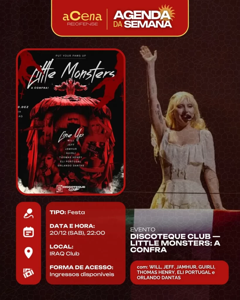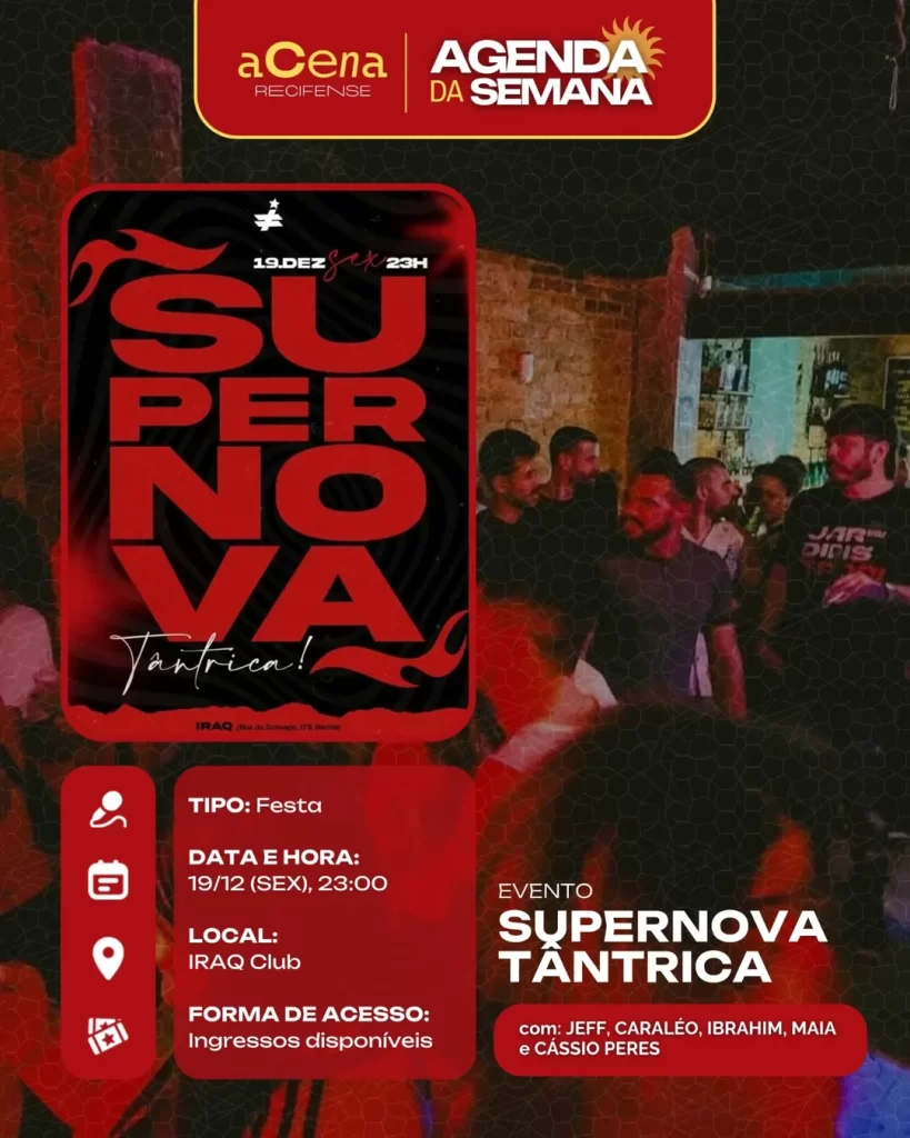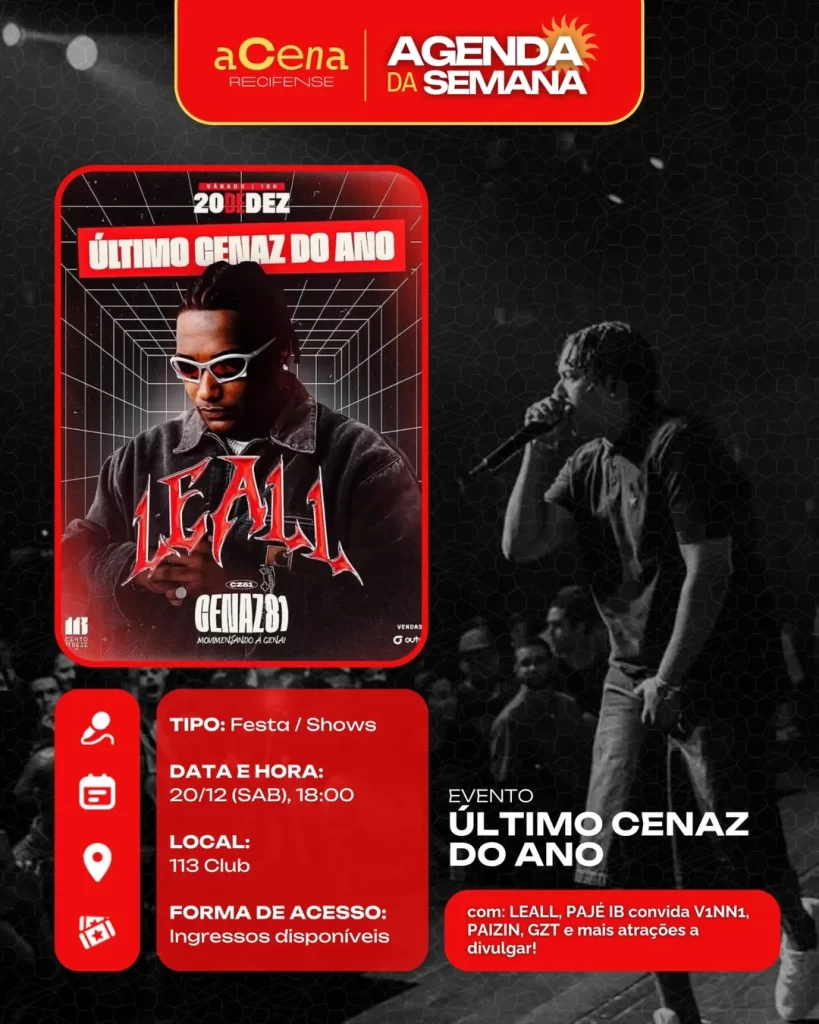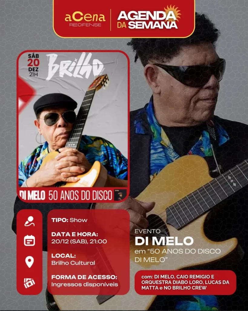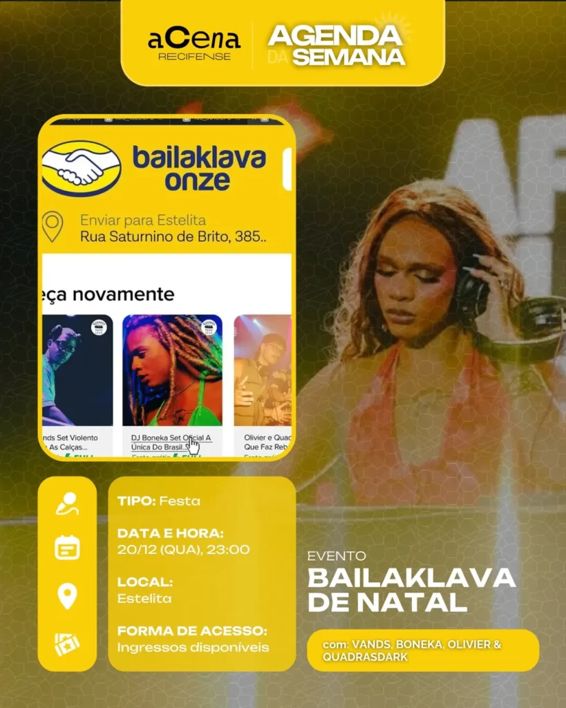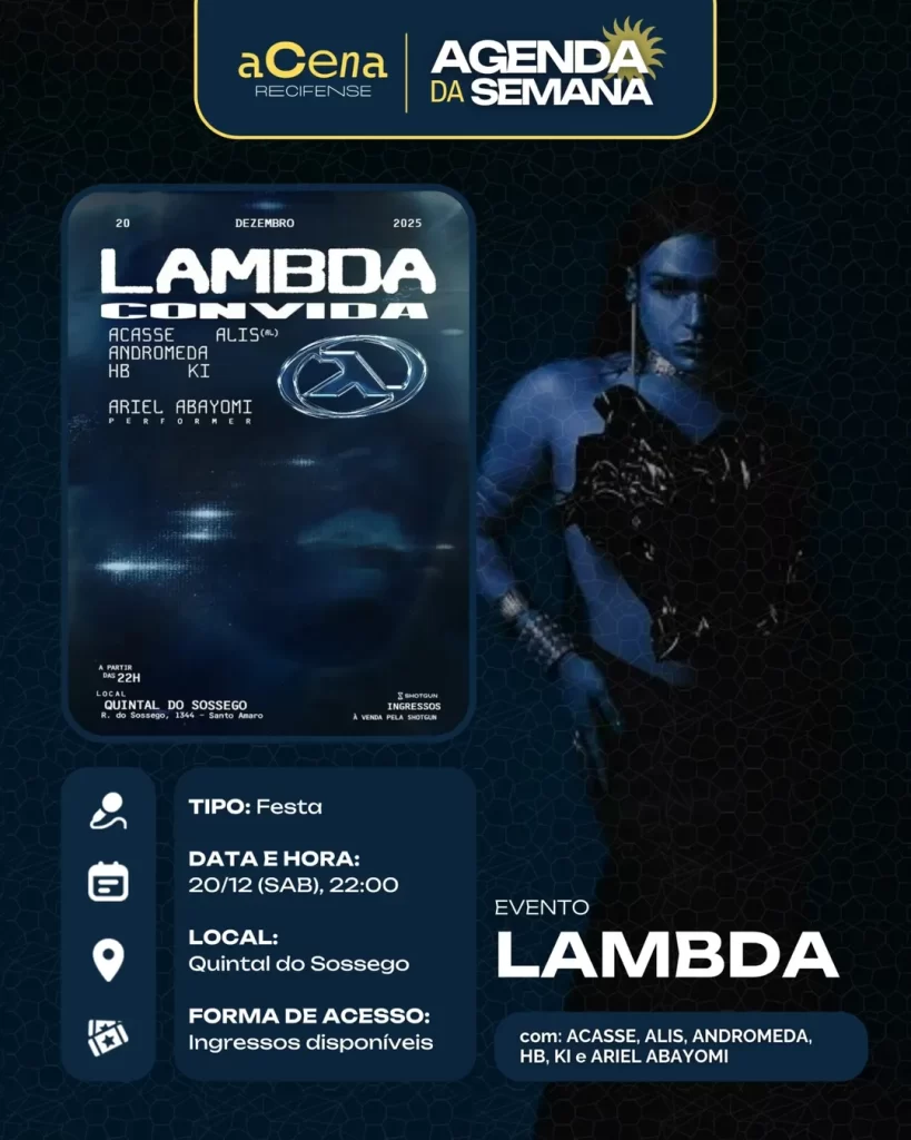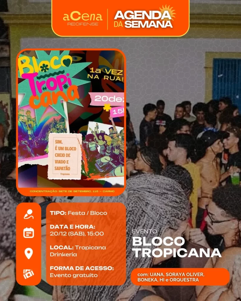 fevereiro 10, 2026 Agenda da Semana: Shows, Festas e Festivais entre 01/12 e 07/12 Agenda Cultural rodrigo Compartilhado FacebookTwitterPinterestWhatsApp Escute a matéria Chegou ela, a mais esperada: a agenda da semana do aCena! Pois o ano pode estar acabando, mas a vontade de sair de casa não! Autor rodrigo Compartilhe Compartilhado FacebookTwitterPinterestWhatsApp Artigo anteriorAgenda da Semana: Shows, Festas e Festivais entre 01/12 e 07/12Próximo artigoAgenda da Semana: Shows, Festas e Festivais entre 29/12 e 04/01 Notícias relacionadas Agenda Cultural Coletiva MaddaM celebra o Dia Internacional da Mulher com Oficina de DJ e festa gratuita no Brilho Cultural Agenda Cultural O Poste inaugura projeto “Luz negra: o negro em estado de representação” com “Àwọn Irúgbin” no terreiro e quilombo Agenda Cultural Dynamite Som – O Futuro é Lamento Negro Agenda Cultural Chão de Estrelas: misturando circo contemporâneo e cultura popular, espetáculo deacrobacias aéreas chega ao Teatro de Santa Isabel
