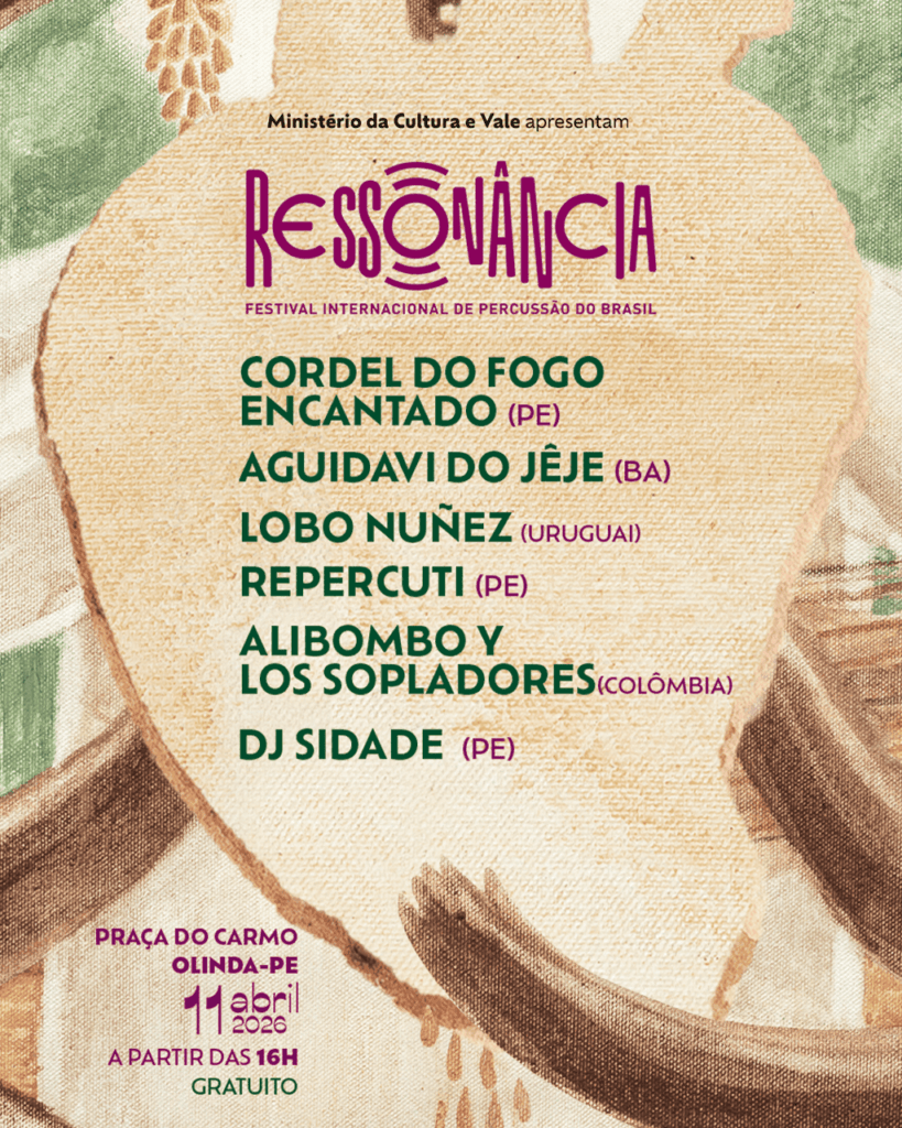 O Ressonância – Festival Internacional de Percussão do Brasil anuncia a programação completa de sua primeira edição, que acontece de 9 a 11 de abril, no Centro Histórico de Olinda. O evento reúne artistas do Brasil e do exterior em uma programação gratuita dedicada à música percussiva, com shows no dia 11 de abril, na Praça do Carmo, e oficinas e masterclasses nos dias 9 e 10, na Casa Estação da Luz.